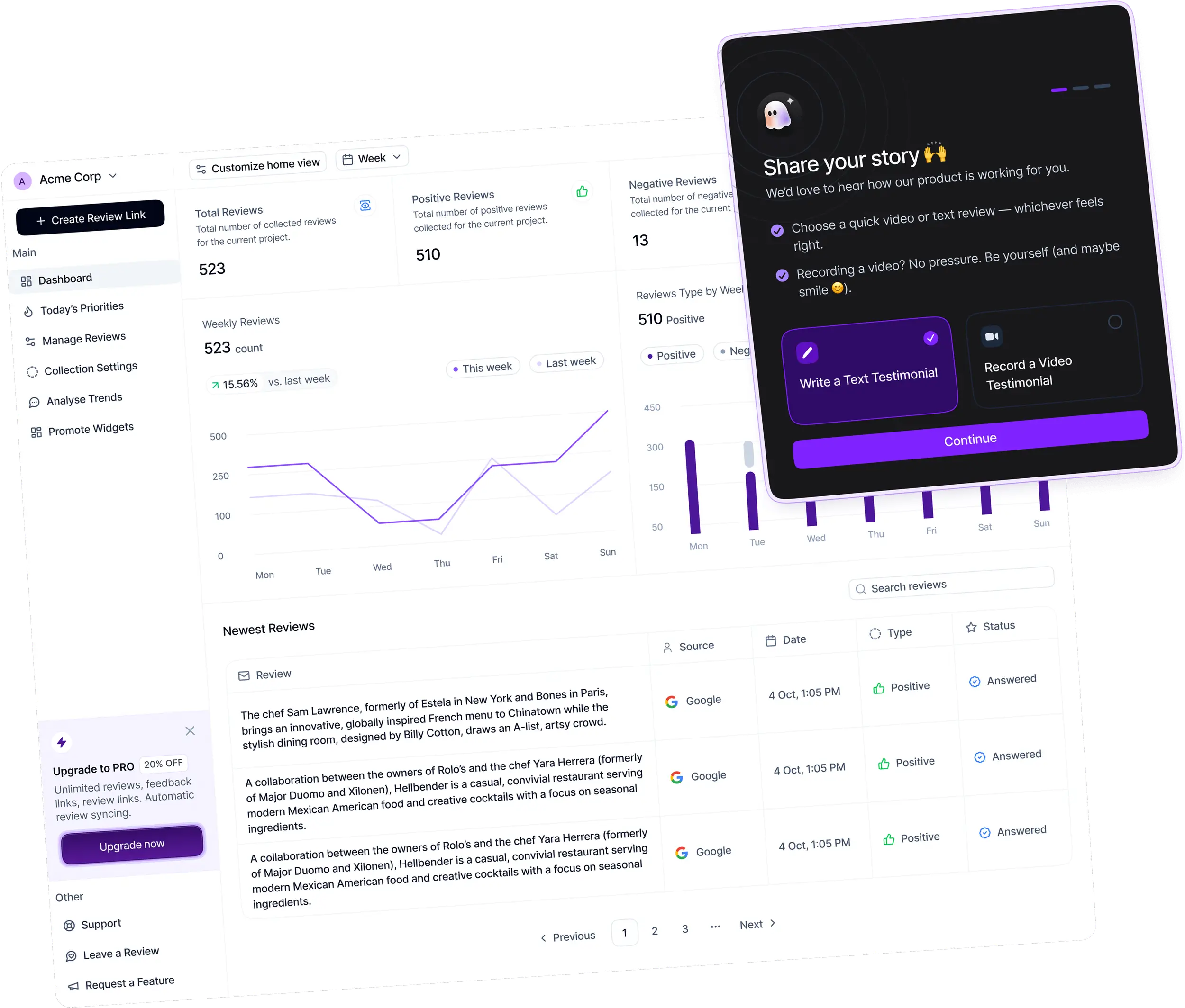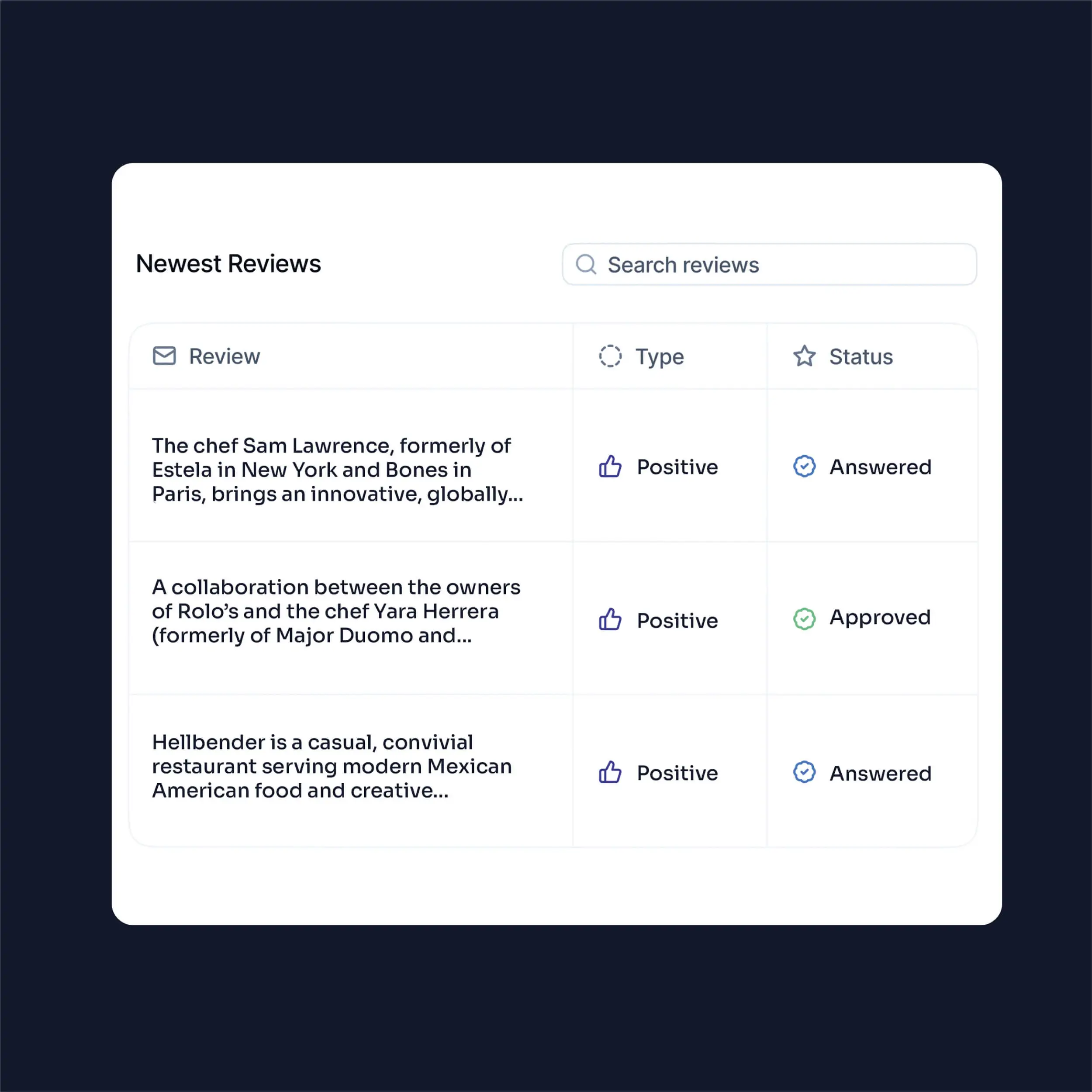 Troof centralizes reviews from 100+ platforms into one smart inbox. Use AI to respond instantly, or let it uncover trends and insights so you can optimize your service based on real feedback.